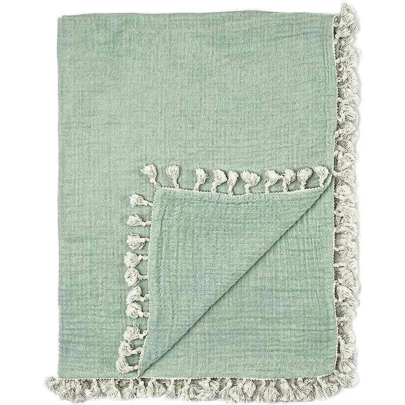 Adorned with tassel trim, our 6 layer muslin blanket evergreen is the perfect boho accent to your nursery or to take along for a stroll through the neighborhood. Made with 100% cotton muslin, it's incredibly lightweight, yet still soft and cozy. Available in 5 earthy colors, including desert rose, copper, ochre, evergreen, and riverstone. Coordinates perfectly with our 100% cotton muslin crib sheets. Eco-friendly dyes.