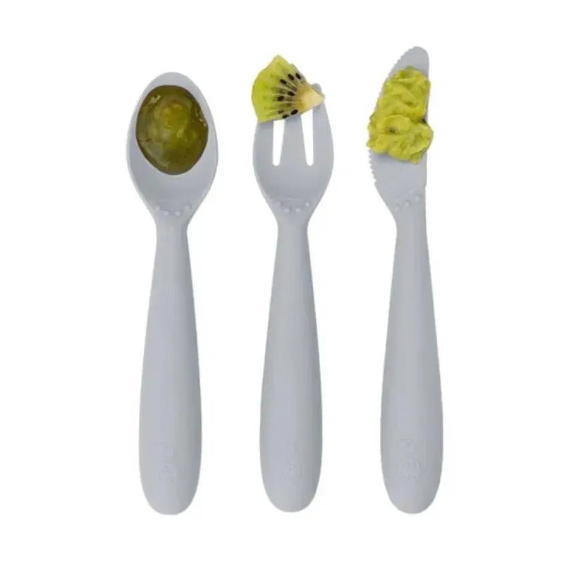 The ezpz Happy Utensils are designed to help older toddlers and preschoolers independently eat with a spoon and fork, and safely practice using a knife (spreading and cutting).