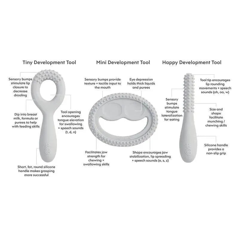 These Oral Development Tools are sensorimotor devices designed to help babies and toddlers practice their feeding, munching, biting and chewing skills. Each set includes 3 development tool pieces that help support the sensorimotor movements for pre-feeding, eating and speech skills and help to build tone and strength of lips, tongue, cheeks, gumline and jaw.