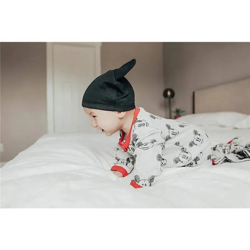 Your little one will love this Mickey Mouse long sleeve, organic cotton sleeper and hat set by finn + emma. Screen art of our leading man's smiling face covers the bodysuit, and the hat features 3D ears.