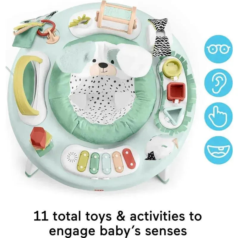 Activity center seat spins for 360 degrees of play with self-discovery activities all around, including a mirror, textured rain stick roller, soft “tissues,” and plush puppy with chime sound