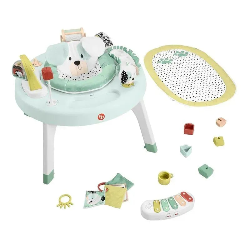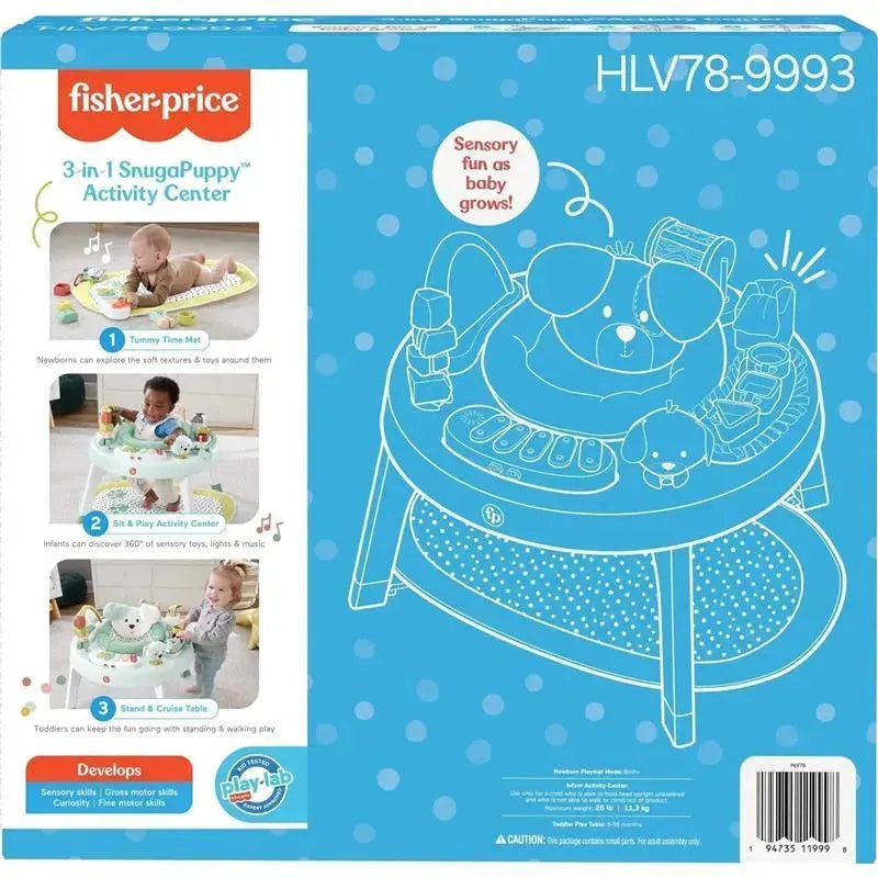 The Fisher-Price 3-in-1 SnugaPuppy Activity Center keeps playtime going and growing along with your baby from tummy time to sitting and spinning to standing and cruising all around. The soft play mat gives newborns space to stretch, while the spinning seat gives babies all-around access to a variety of sensory toys and activities, including a light-up xylophone with 20 minutes of music! As they grow, toddlers can stand and explore all their favorite activities around the table. Activity center max weight 25 lb/ 11,3 kg. Use only for a child who is able to hold head upright unassisted and who is not able to walk or climb out of product.