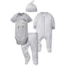 Your little one will be both cute and comfortable with this adorable lamb set. It features a short sleeves bodysuit, footed sleeper, footed pants and a matching cap. Essential for every newborn, this set is a great baby shower gift.