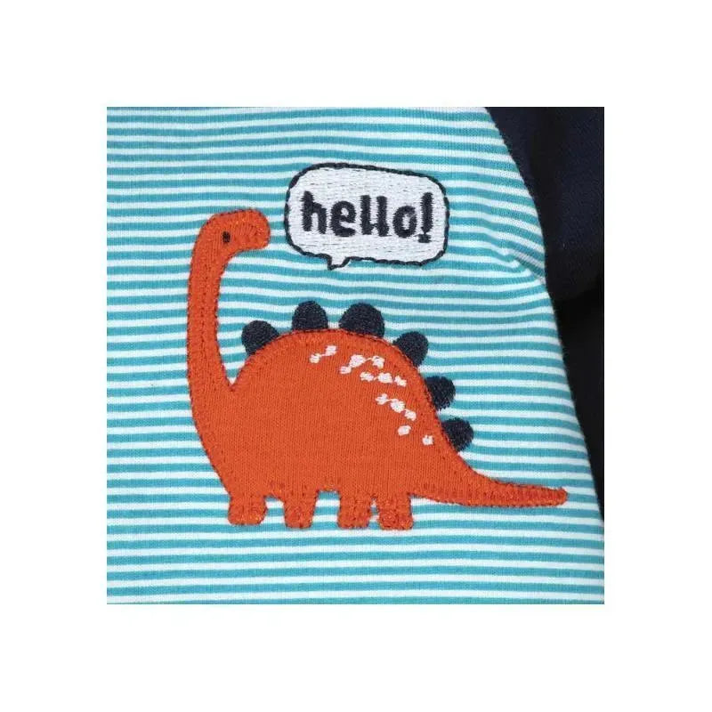 This sleep n play has blue and white stripes with a cute orange dinosaur saying 'Hello' on it.