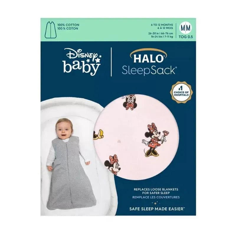 Disney’s most famous characters join HALO® to make safe sleep more magical than ever. Our original SleepSack® wearable blanket now comes in 4 exclusive Disney designs, featuring classic icons Mickey and Minnie in endearing contemporary designs. SleepSack® nestles baby like a soft blanket, without the risk of sleep-related dangers. Signature “Back is Best” embroidery is a gentle reminder to place baby in the recommended sleep position. Features a 2-way zipper for easy diaper changes and a roomy sack design that’s recognized by the International Hip Dysplasia Institute as promoting healthy hip development. Size: 0 – 24 Months, 4 sizes available. TOG: 0.5 - Ideal for warmer temperatures (75 - 80° F). 100% cotton. Can be layered with warmer sleepwear for cooler temperatures. Product care: Turn inside out and close zipper before laundering. Machine wash warm with like colors on gentle cycle. Close zipper before washing. Tumble dry low. Do not bleach, iron or dry clean. Safety reminder: Always place your baby on their back for sleep. And, never place anything in the crib with your baby. No pillows, bumpers, toys or loose blankets. The American Academy of Pediatrics recommends the use of wearable blankets to keep your baby warm.