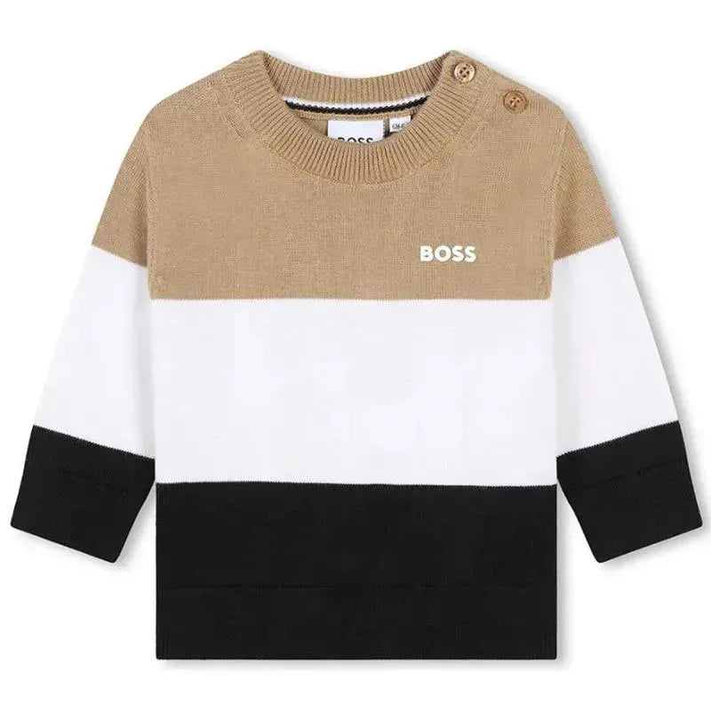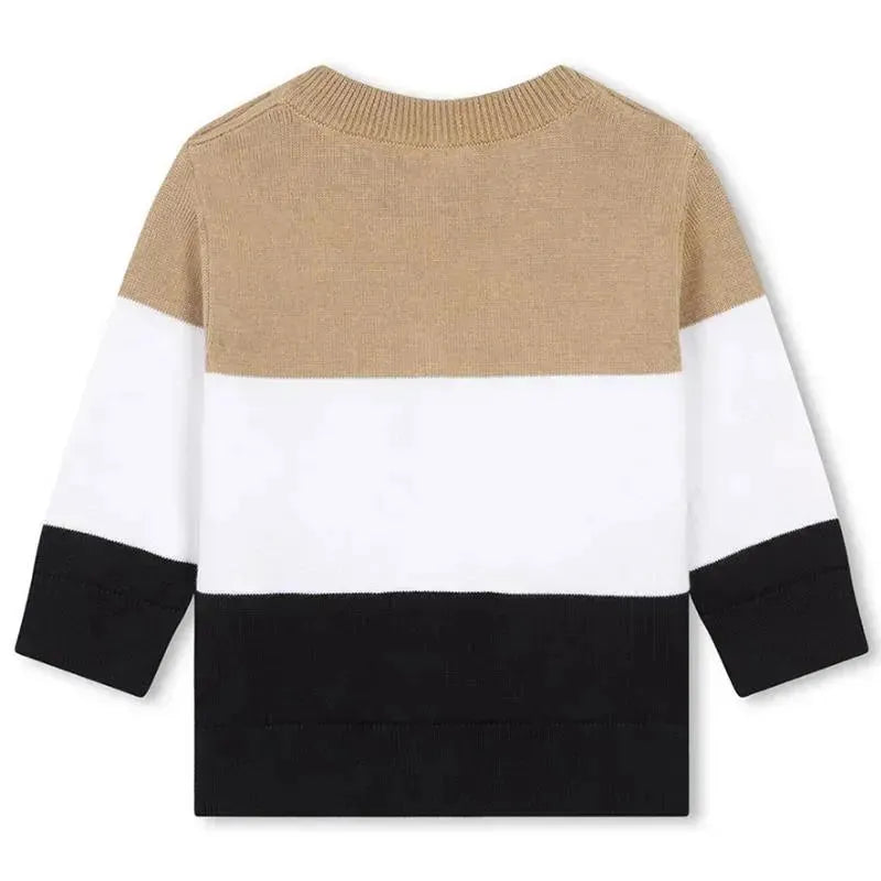 Brown cotton sweater, black and white striped, with long sleeves, ribbed crew neck, button closure on the shoulder, ribbed cuffs and hem. It is embellished with rubberized logo on the chest.