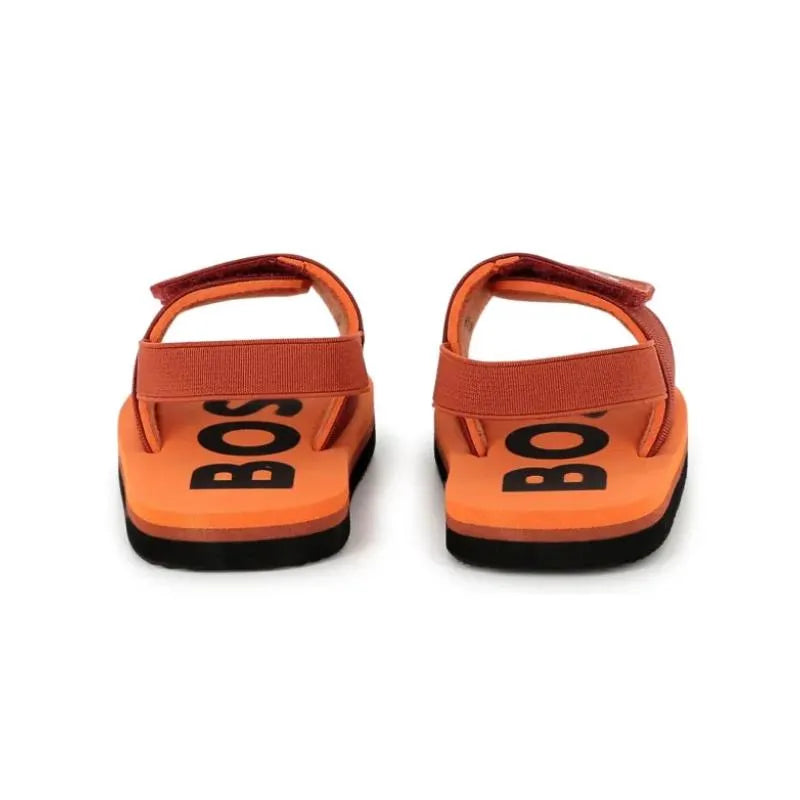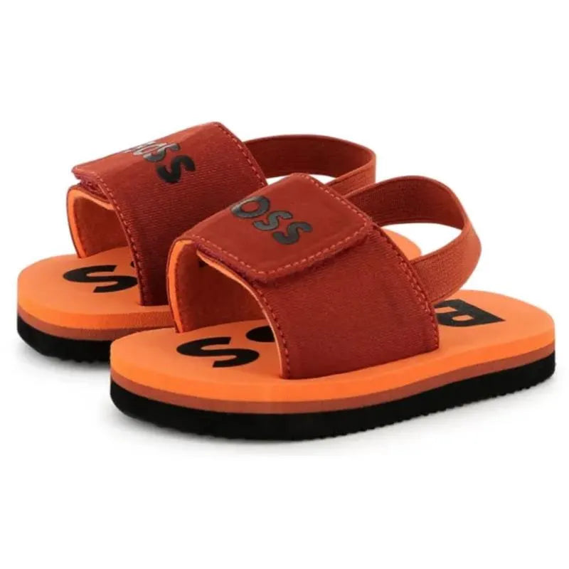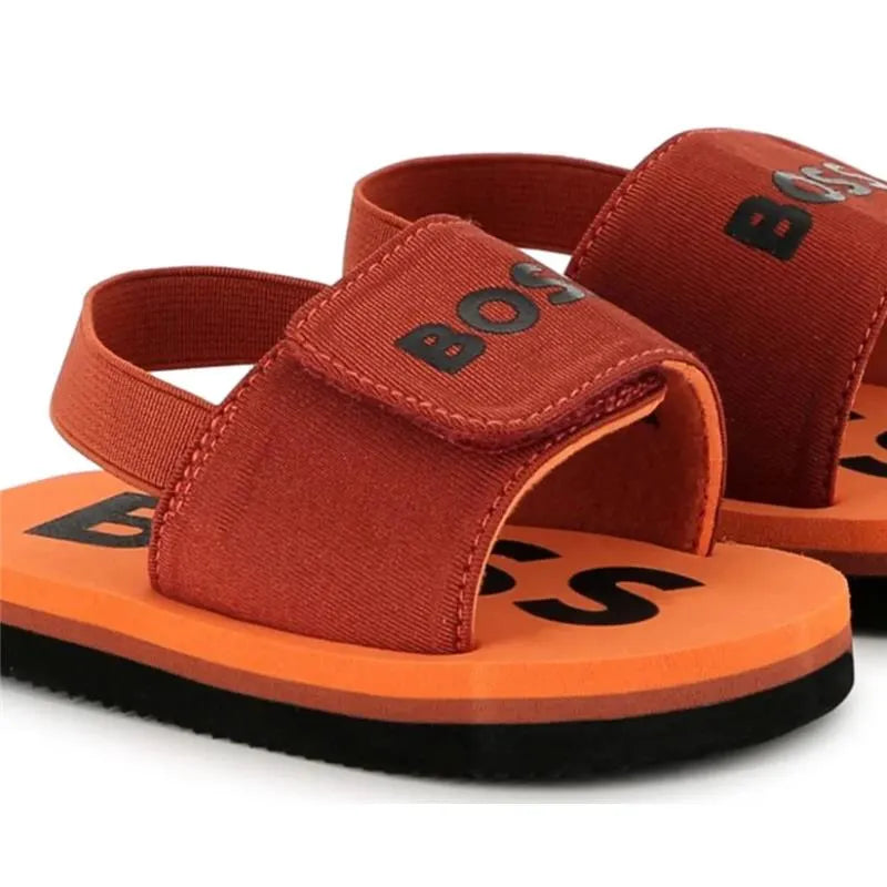 These imported BOSS Kidswear sandals in a stylish clay red shade offer both comfort and practicality for little feet. Designed with a secure front touch-strap fastening and an elasticated slingback strap, they provide a snug and adjustable fit. The flat rubber sole ensures stability, while the branded footbed adds a signature touch. Perfect for warm-weather adventures with effortless style.