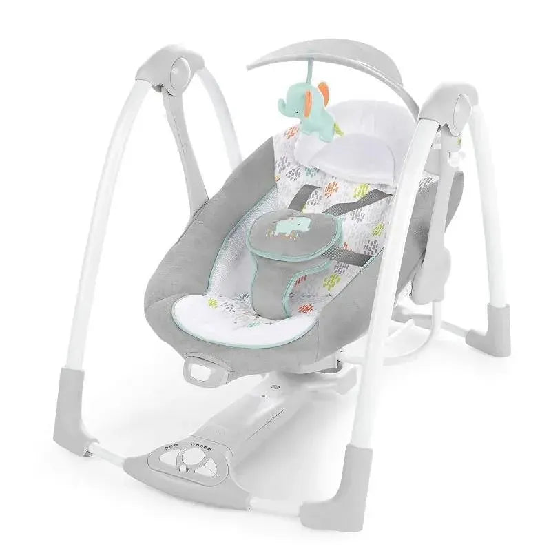 There’s nothing better in the world than newborn snuggles. But life happens, and you’ll need your hands free. With the ConvertMe Swing-2-Seat from Ingenuity, your little one can hang out nearby while you cross off your to-dos. When your infant wants to sway, the automatic swing setting will calm and comfort. Convert it into a stationary vibrating seat with our secure EasyLock system. USB cord included-saves money on batteries.This travel friendly baby swing features a foldable design so it can lay flat for storage and portability. Soothe your baby with relaxing tunes or keep him entertained with the pivoting toy bar. The plush seat pad and removable head rest are laundry safe and easy to clean. Whether at home or away, this compact swing-to-seat is ready for the ride.