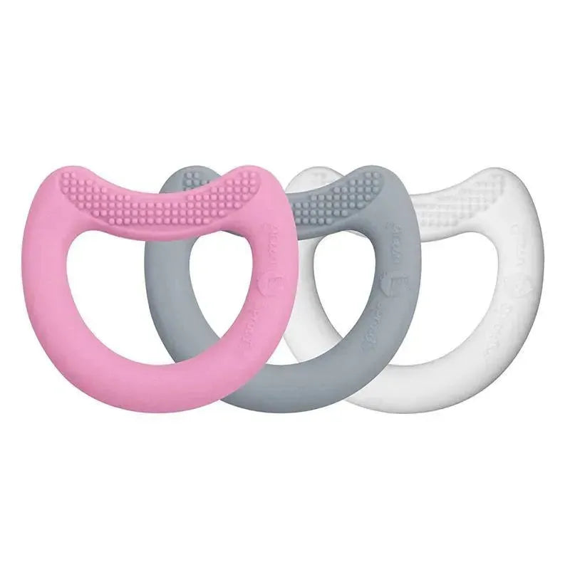 Pink set includes 3 soft teethers made from silicone to soothe gums and relieve pan during teething.  They feature a curved ring shape, perfect for little hands to hold.