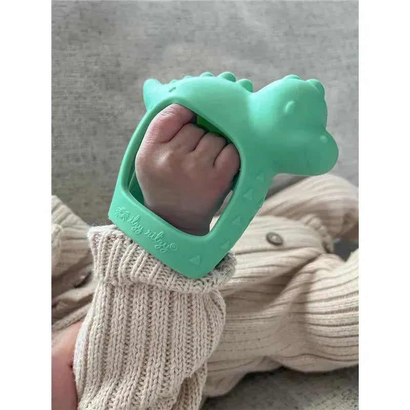 The open hand slots fit easily around baby’s wrist and the crossbar grip makes this the perfect (and hygienic!) no-drop teether