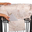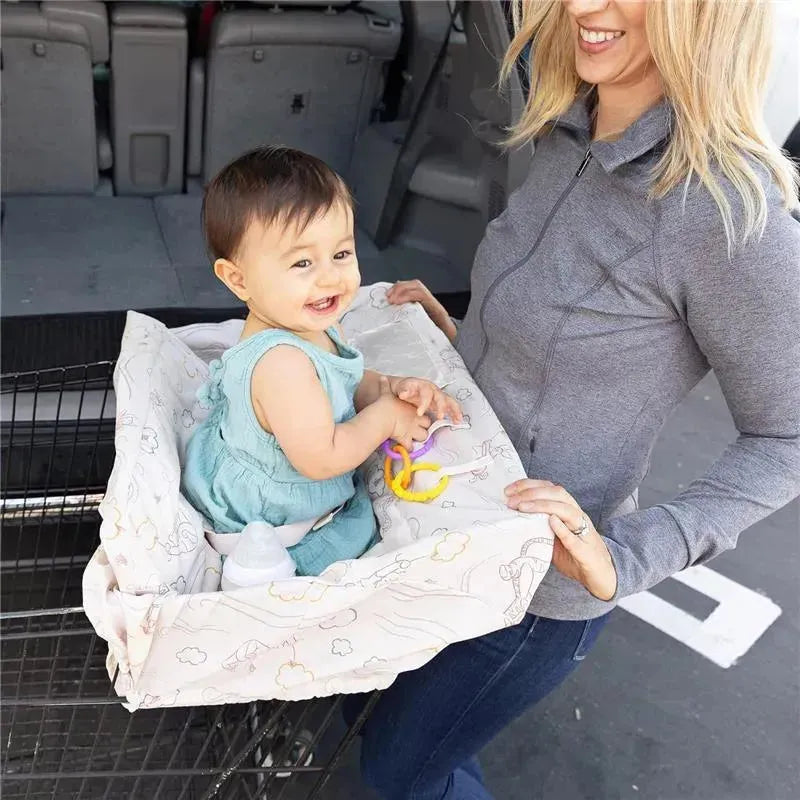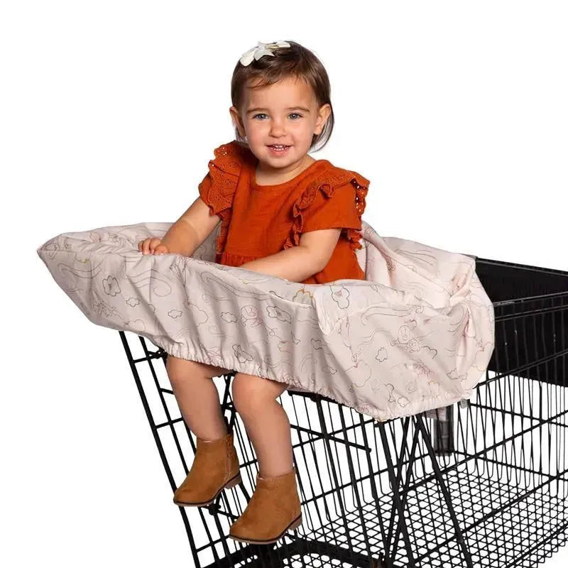Protect your child from dirty surfaces while in a shopping cart or restaurant high chair with the Disney Baby by J.L. Childress Shopping Cart and High Chair Cover. The extra-large size fits all shopping carts and restaurant-style high chairs, ensuring that handles and touchable surfaces for both you and your child are covered. The cover features loops to attach toys and an elastic pocket to hold a bottle or cup. Keep your smartphone protected in the clear pocket. The pocket features a clear window that protects your phone from touching, while still allowing you to access shopping lists or entertain your child. A fully padded seating area, soft cotton fabric and a built-in buckle strap ensure your child is comfortable and secure. The cover stuffs into an attached zippered pouch, keeping the cover clean and contained. The zippered pouch also functions as a pocket for when you're shopping. Machine washable.