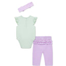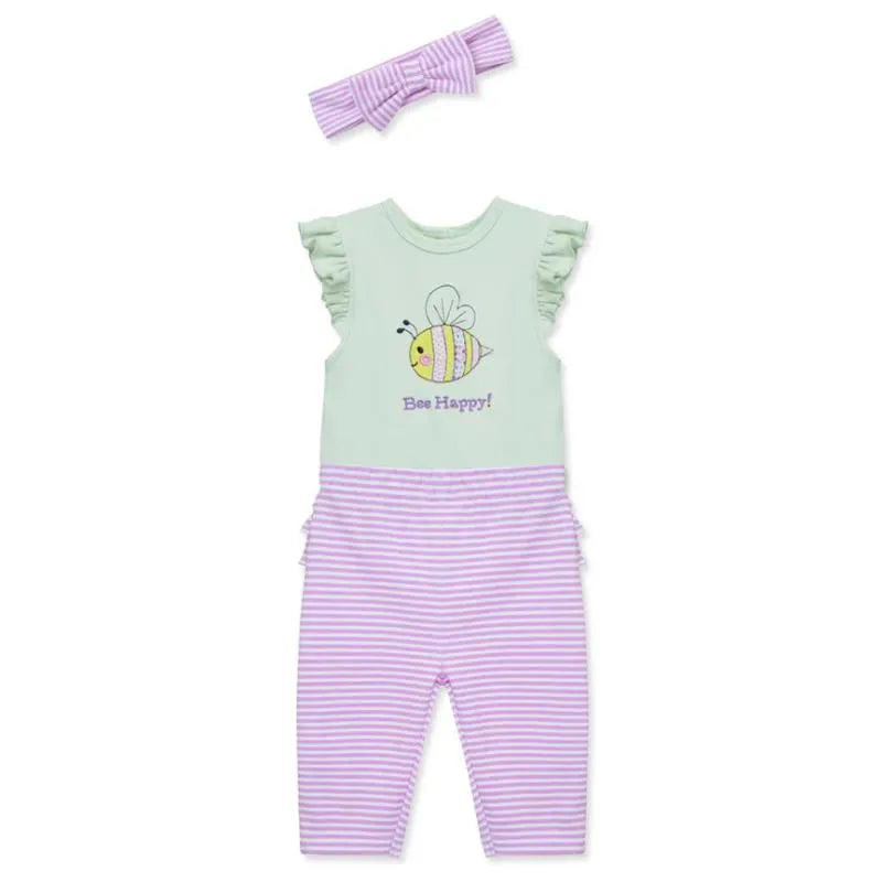 This baby girls' 3-piece bodysuit set will have her buzzing with fun! Made from soft cotton, this set includes the Bee Happy green bodysuit, coordinating stripe bottoms, and a matching headband that will surely bee lovely all season long!
