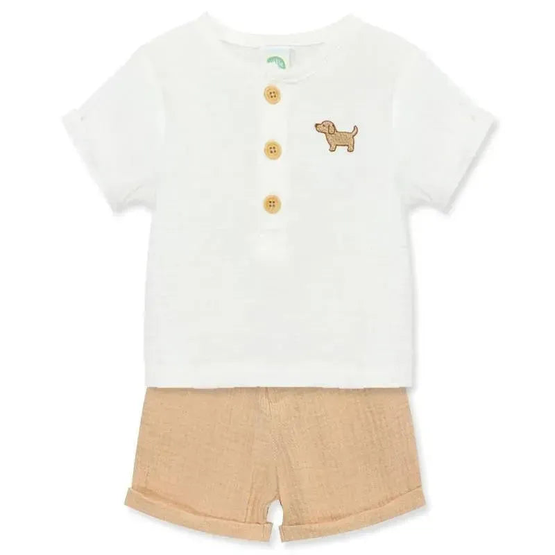 A newborn baby boys' tee and shorts set is barking in cuteness and comfort.