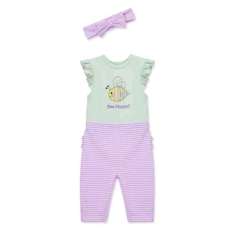 This baby girls' 3-piece bodysuit set will have her buzzing with fun! Made from soft cotton, this set includes the Bee Happy green bodysuit, coordinating stripe bottoms, and a matching headband that will surely bee lovely all season long!