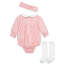 Your little one will look extra-adorable in this picture-perfect smocked romper and sock set for newborn baby girls.