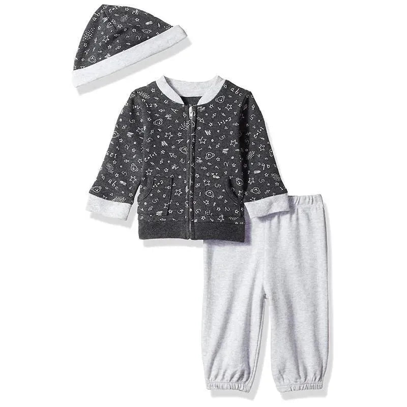 The Jacket with crew neck, zipper closure, long sleeves and front pocket. The pant with elasticize waist. This set includes a Hat allover print. It is perfect for your boy still warm and comfy.