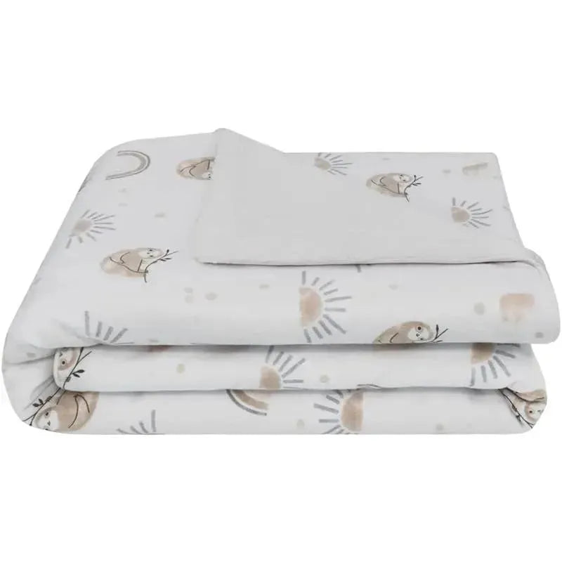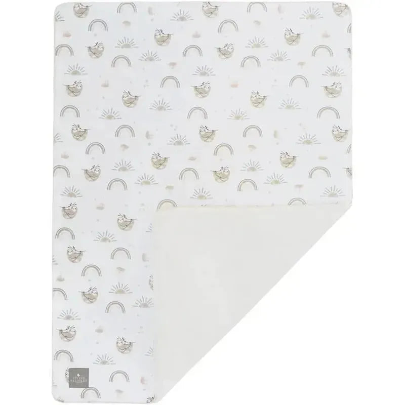 Our gorgeous double-layered stroller blanket features a 100% cotton jersey watercolor rainbow sloth print on one side, and the softest Sherpa on the other; perfect for keeping baby warm and cozy when out and about.