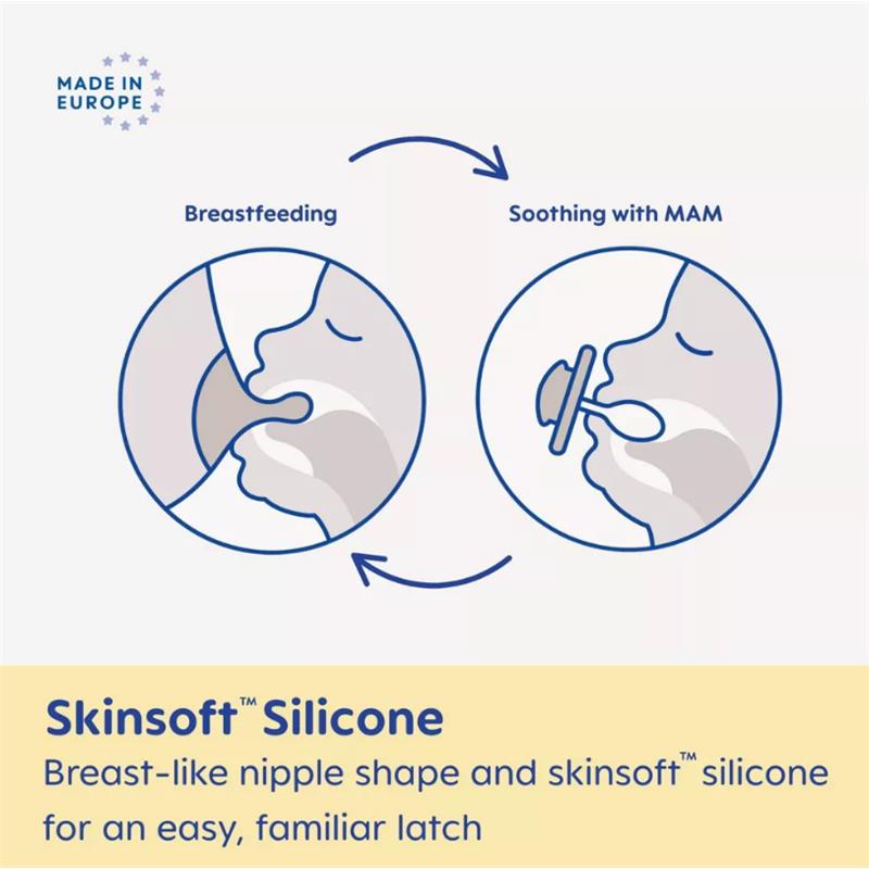 Just because your baby's skin needs a bit of extra love and care shouldn't mean that baby has to forego the soothing comfort of a pacifier. The MAM Air Night Pacifier has a shield that is specially designed for babies with sensitive skin. The extra wide air holes allow plenty of circulation around your baby's mouth and even allow you to peek at their little smile. This special glow in the dark collection helps keep baby's binky in sight without having to turn on the light and disturb baby's sleep. All MAM pacifiers feature our trademarked SkinSoft silicone nipples that feel like mom and help babies transition from breast to pacifier. In fact, Market Research showed that MAM nipples are easily accepted by babies of all ages, with 94% nipple acceptance among babies tested.*