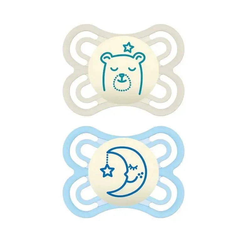 This pack includes 2 MAM blue and clear Glow-in-the-dark pacifiers from Perfect Night Collection, with bear and moon designs.