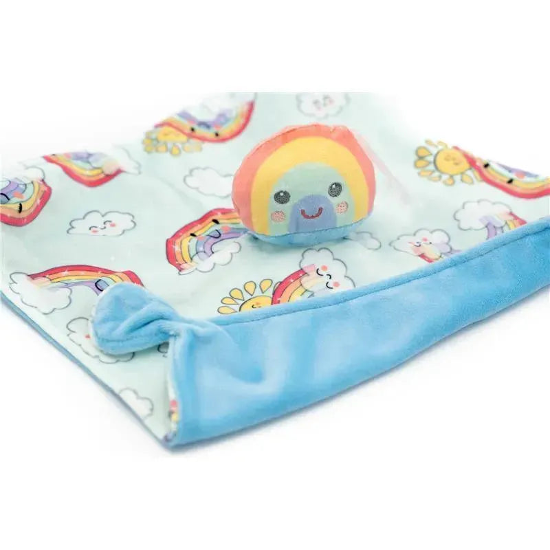 DESIGNED FOR CUDDLING: Luxuriously soft blanket's top is a cheery rainbow print on light blue, underside is smooth sky blue lining; features gathered corners that babies love to explore and chew on
