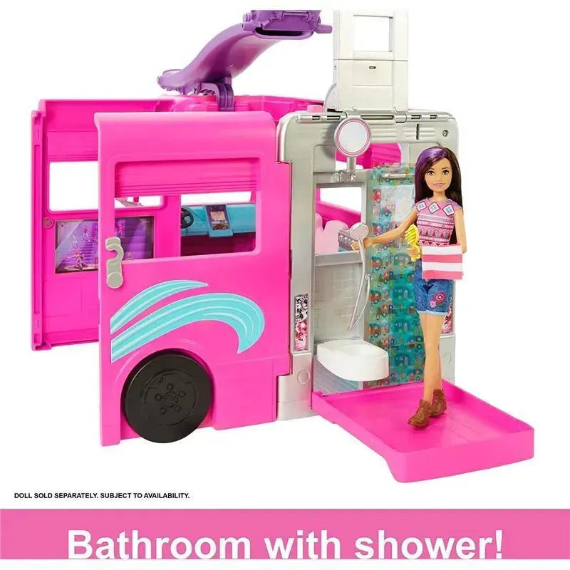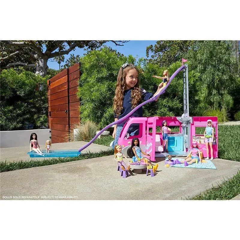Hit the road to adventure with the Barbie Dream Camper featuring an epic slide, 7 play areas and everything imaginations need to play out the ultimate camping trip!