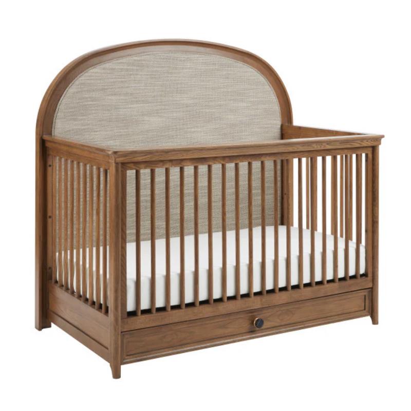 The Maxi-Cosi Quiet Luxury 6-in-1 Convertible Crib is the centerpiece of this collection. Designed with a tall, gracefully arched headboard upholstered in a soft polyester-blend fabric, it blends warmth and modernity through rounded edges and a soothing wood finish. A practical under-crib storage drawer offers convenient space for blankets, bedding, and everyday essentials—keeping your nursery clean, organized, and beautifully put together.
