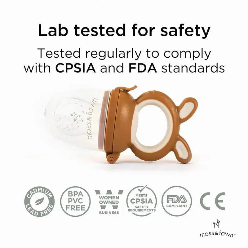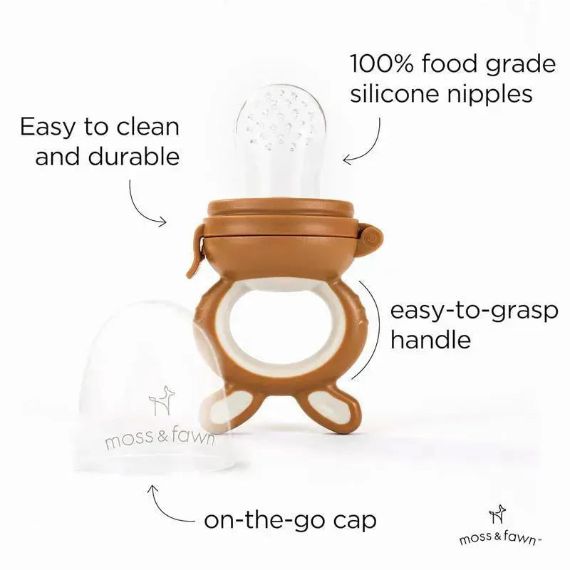 Introduction to Solids: The Moss and Fawn Forage Feeder helps infants transition from a milk-only diet to solid foods by offering a safe and manageable way to experience different flavors and textures. Our Forage feeder silicone material prevents large pieces of food from entering the baby’s mouth, reducing the risk of choking.
