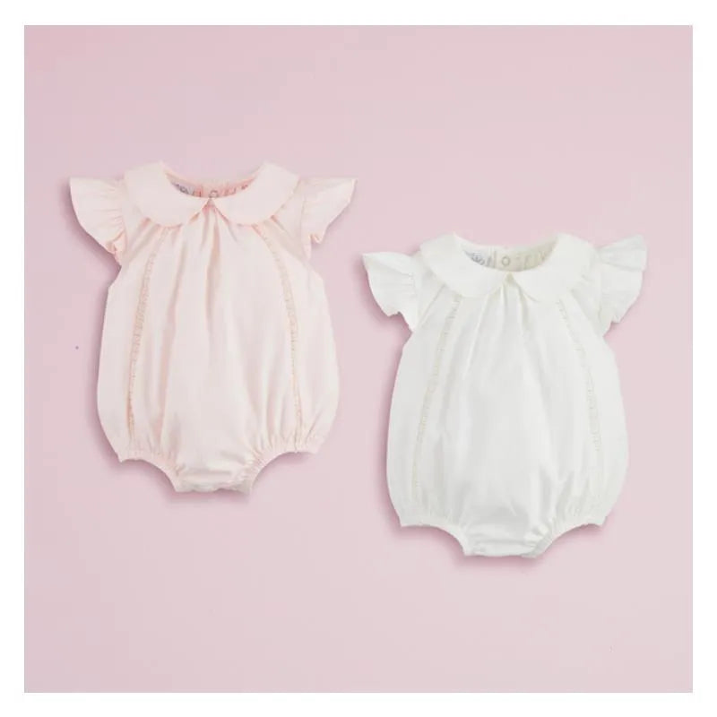 The Collared Poplin Baby Bubble is a charming and stylish outfit designed for infants aged 6-9 months. This adorable bubble features a classic Peter Pan collar that adds a touch of timeless elegance. The circle inset eyelet trim enhances the overall design with delicate detailing, making it perfect for special occasions or everyday wear. Crafted from a blend of 59% polyester and 41% cotton, this garment offers a comfortable and breathable fit for your little one. The inner leg snaps ensure easy diaper changes, providing convenience for parents. This delightful piece combines both style and practicality, making it a must-have addition to your baby's wardrobe.