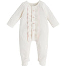 The sleeper features an elegant ruffle pearlized button placket, adding a touch of sophistication and charm to the overall design