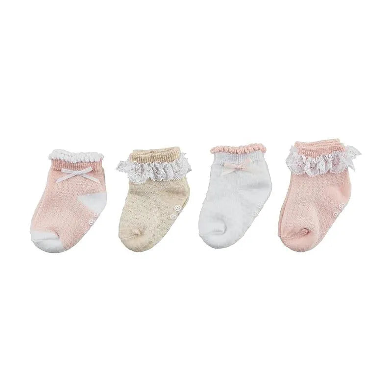 Delight in the charm and elegance of this exquisite set of four pointelle infant socks, thoughtfully designed to add a touch of sophistication to your little one's wardrobe