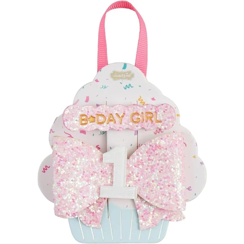 Complementing the bow is a coordinating acrylic "B-day Girl" clip, designed to add a playful and festive touch to the ensemble