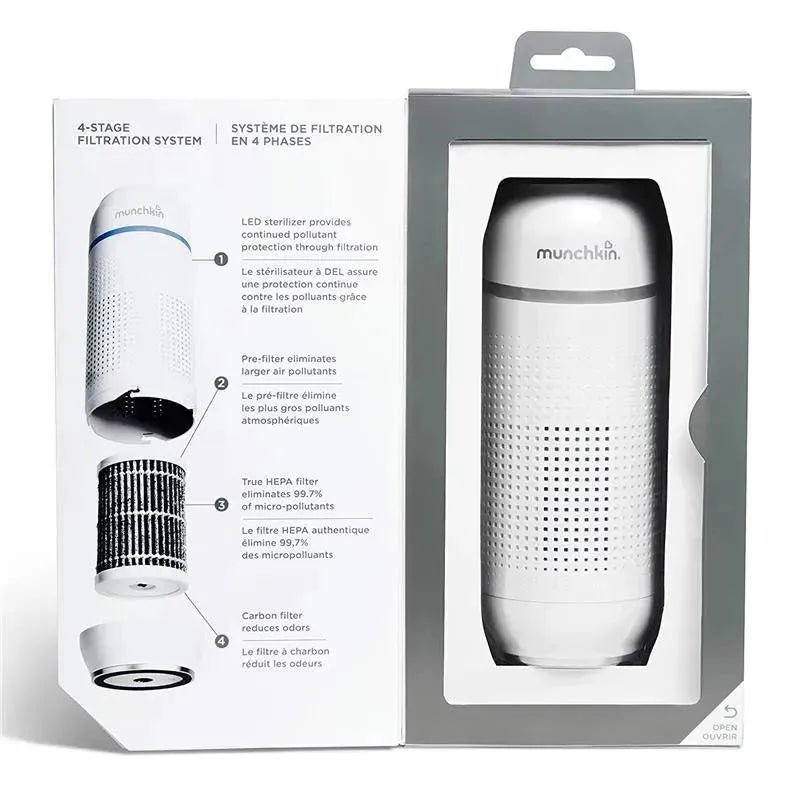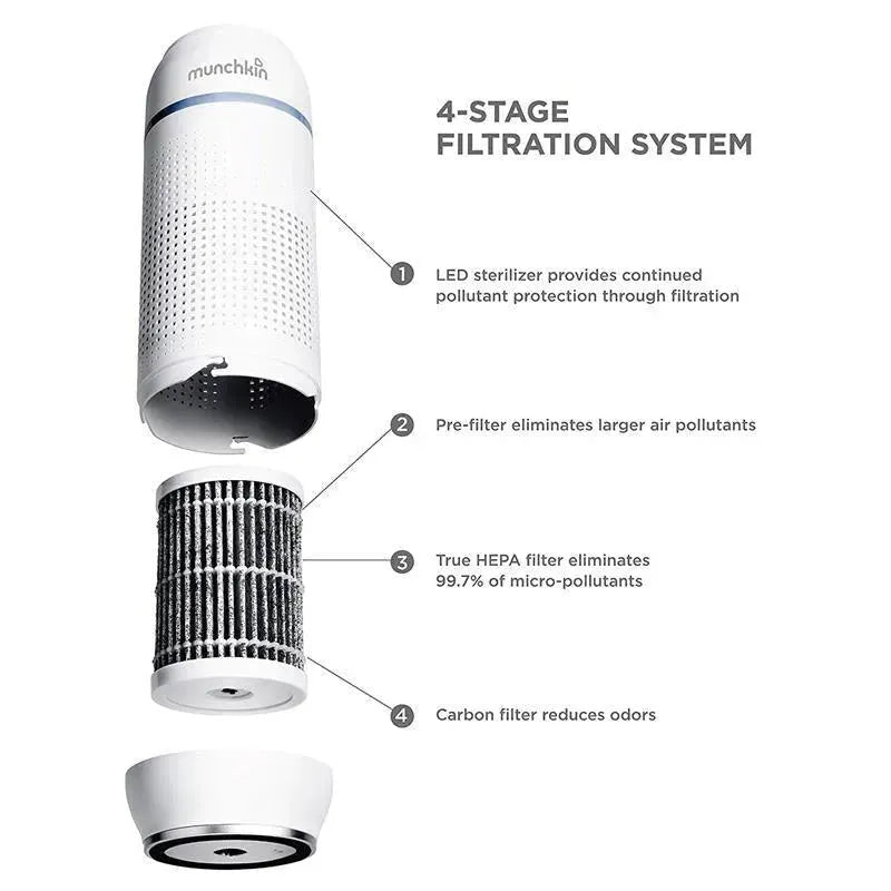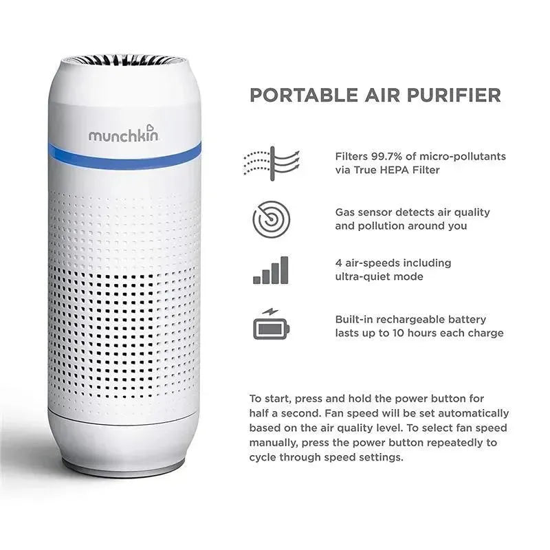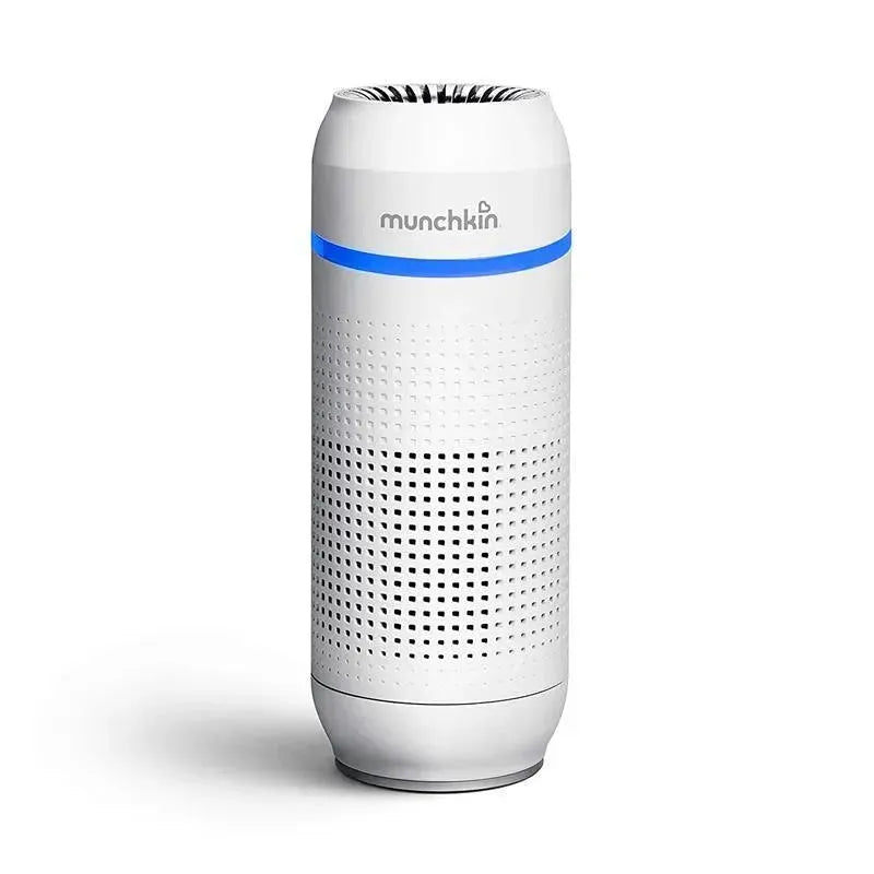 Babies inhale roughly 50% more air than grownups and kids, so they’re especially vulnerable to polluted indoor air. Help to protect baby growing lungs with Munchkin portable Air Purifier, which creates a 7-foot “bubble” of clean air wherever you go! Small enough to fit a standard cup holder, this compact air sanitizer delivers peace of mind through a powerful 4-stage filtration system and utilizes a True HEPA air filter to eliminate 99.7% of micro-pollutants and allergens. Contaminants can linger indoors, but this travel size air cleaner gives you better control over your baby’s environment – so you can both breathe easier.