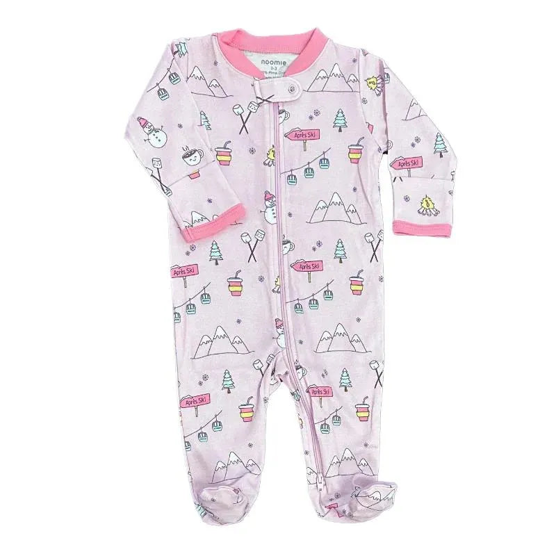 Embrace the cozy comfort of après-ski vibes with our Après-Ski baby girl footie! This baby girl onesie features a charming print inspired by the snowy slopes, hot cocoa mugs, and snowy mountains.