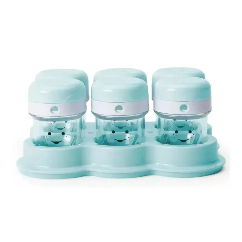 Freezer Tray holds six 4oz portions; Date-Dial Cups are 3oz; Reusable Pouches hold up to 3oz