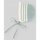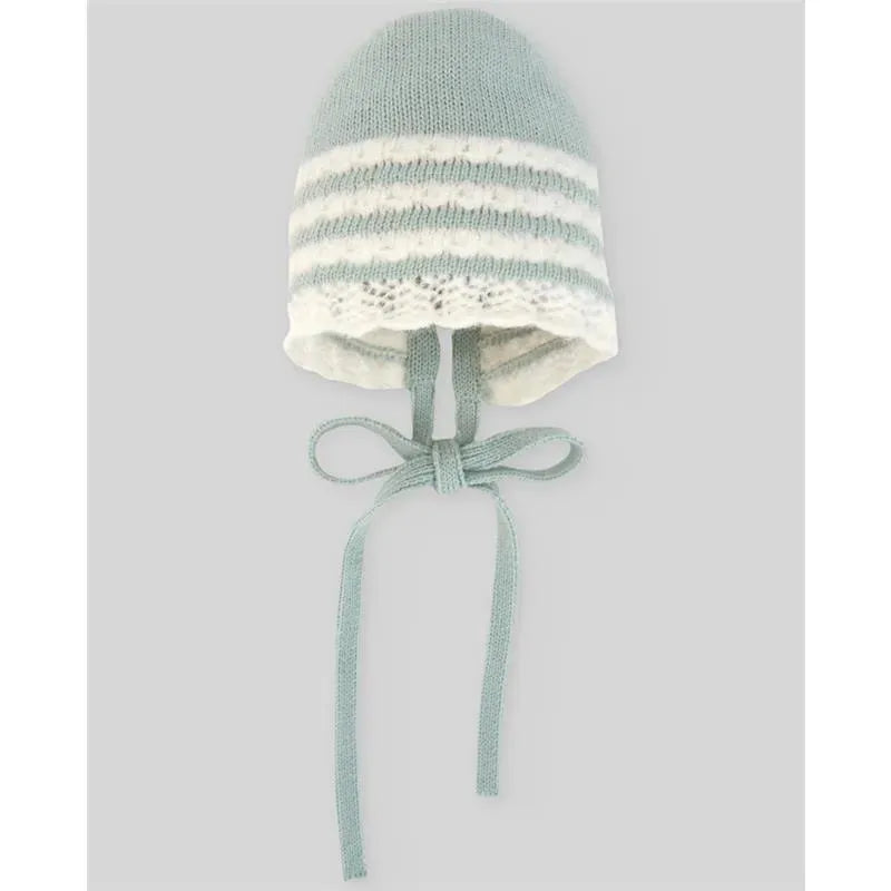 Knitted bonnet with combined two-tone design and wavy finish. Closure with matching tie. Adjustable cords for greater comfort.