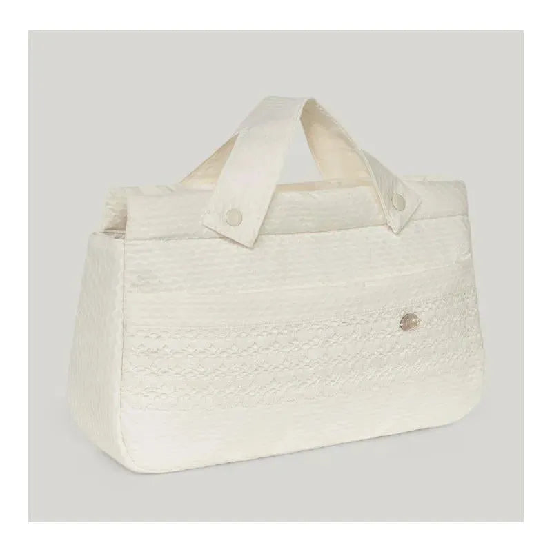 Diaper bag made of quilted piqué with wide embroidered decorative strip. Ideal for carrying all the baby essentials. Can be hung on the baby stroller. Includes a shoulder strap.