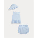 This sweet set includes a sleeveless peplum Polo shirt, ruffle-trim bloomers, and a matching hat. Each piece is made with soft cotton interlock and embroidered with our signature Pony.