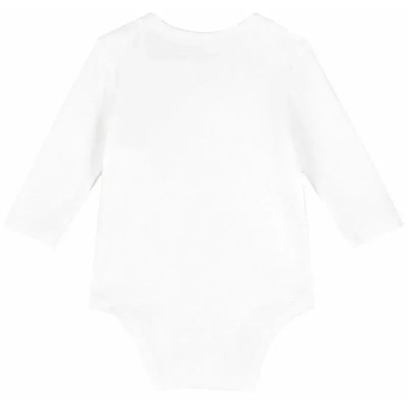 White logo bodysuit for baby boys and girls by Ralph Lauren. Made from soft cotton, it features the brands signature pony embroidered on the chest and popper fastening between legs for easy dressing.