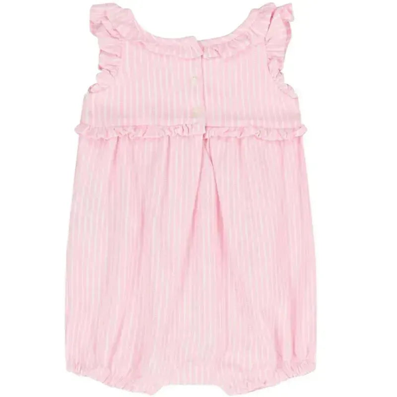 Pink and white romper by iconic brand Ralph Lauren. Made in stretchy cotton pique, it features the brands iconic pony embroidered on the chest. It has a round collar and ruffled trims. Fastens with a buttons at the back and poppers between legs for easy dressing.