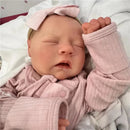 This beautiful white baby doll reborn has painted hair and closed eyes.