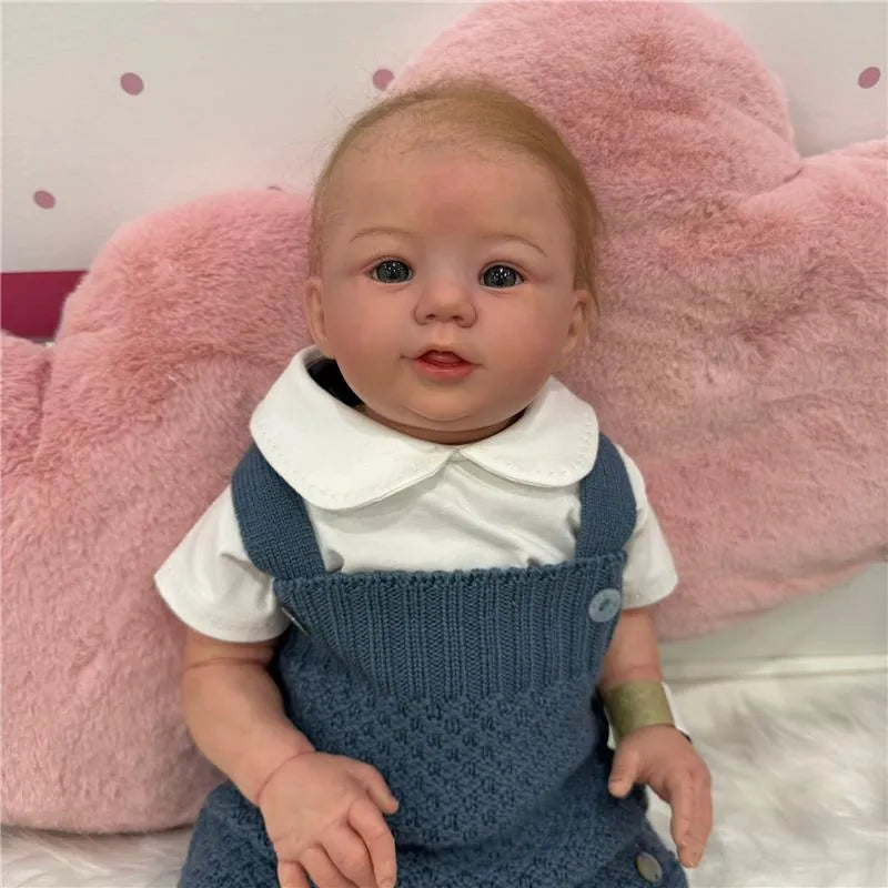 This beautiful white baby doll reborn boy has rooted auburn, open blue eyes.