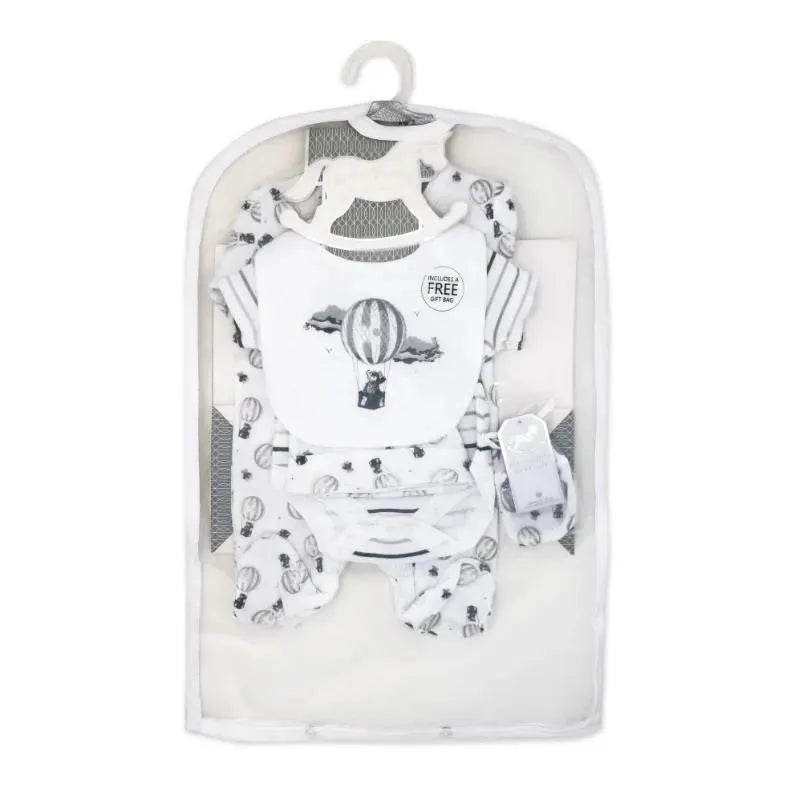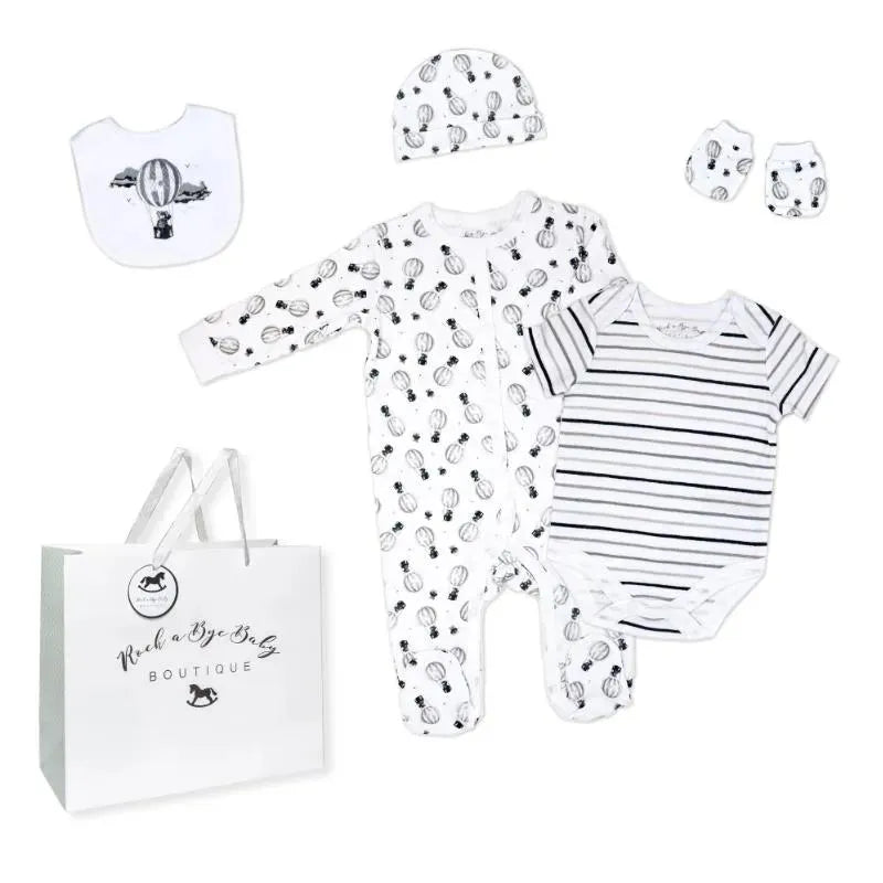 Take your little one on an adventure with this adorable hot air balloon bear-themed 5-piece set. The set includes a cozy sleeper, soft bodysuit, matching hat, mitts, and bib, all designed for comfort and style. Packed in a charming organza mesh bag with a gift bag included, this set makes a perfect gift or a delightful addition to your baby’s wardrobe.