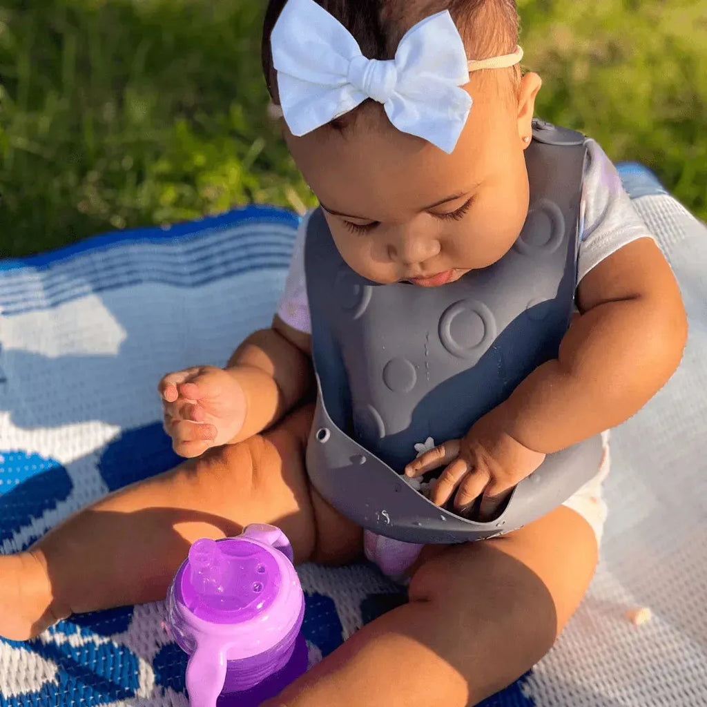 This is not your average Bib. This is the ONE you NEED when heading out - whether it’s a restaurant, running errands, or just snacking outside.  Its oversized pouch keeps messes better contained and tethers keep utensils attached.  Made of 100% Food-Grade Silicone, it’s easy to clean, and safe and gentle for your baby.