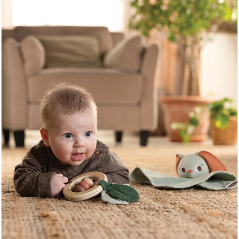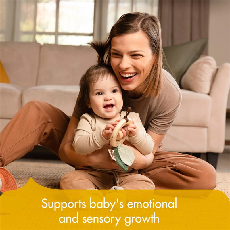 The set also includes a charming wooden rattle, designed to foster motor skills and sensory and cognitive development. The rattle creates an intriguing audio sensation, while its textured surfaces encourage tactile exploration. Your baby is introduced to the concept of cause and effect as they begin to understand their actions can make the rattle sound.
