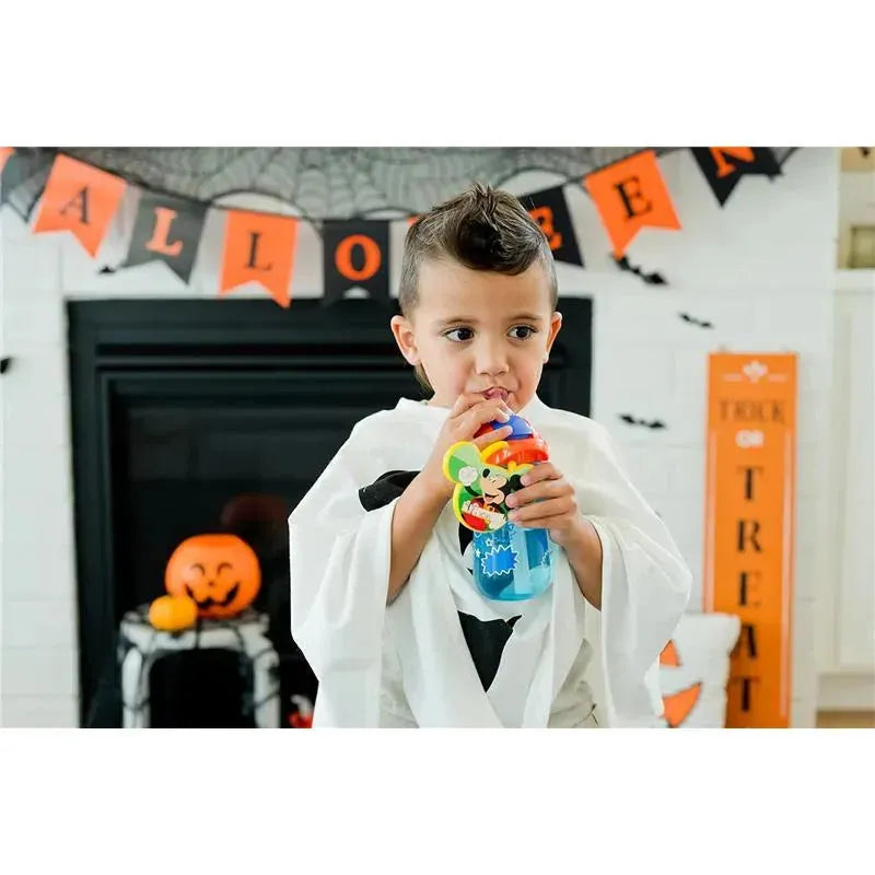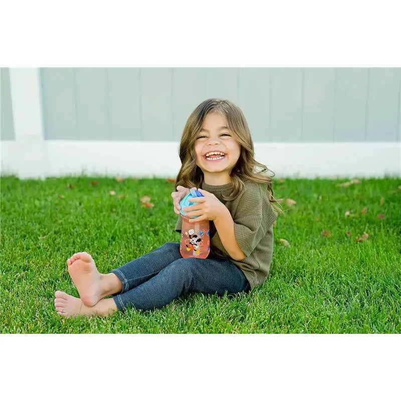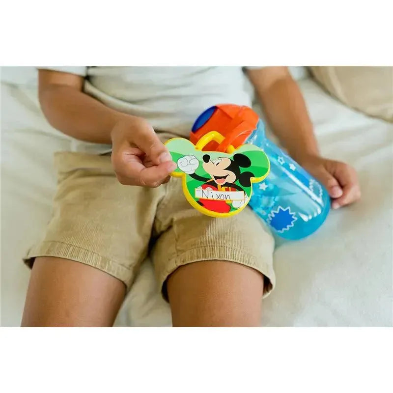 The Disney Mickey Mouse Flip Top Straw Cup helps toddlers sip with less mess. The spout cover on this toddler cup slides open and closed to keep the straw clean and spill-proof when not in use, while the silicone straw has a fast-flow design that promotes proper oral development. This fun toddler sippy cup features Mickey Mouse and comes with a cute name tag charm that's perfect to hook onto back packs, day-care gear, diaper bags and more!