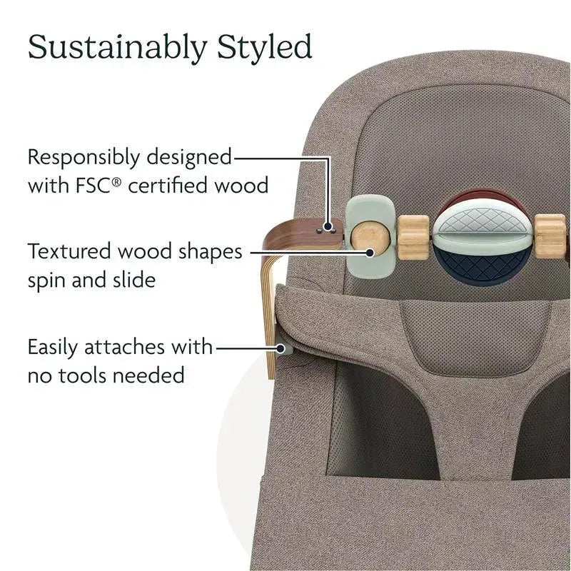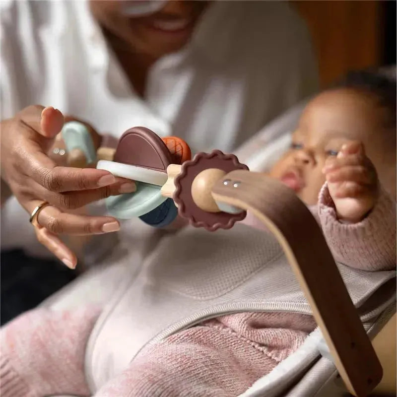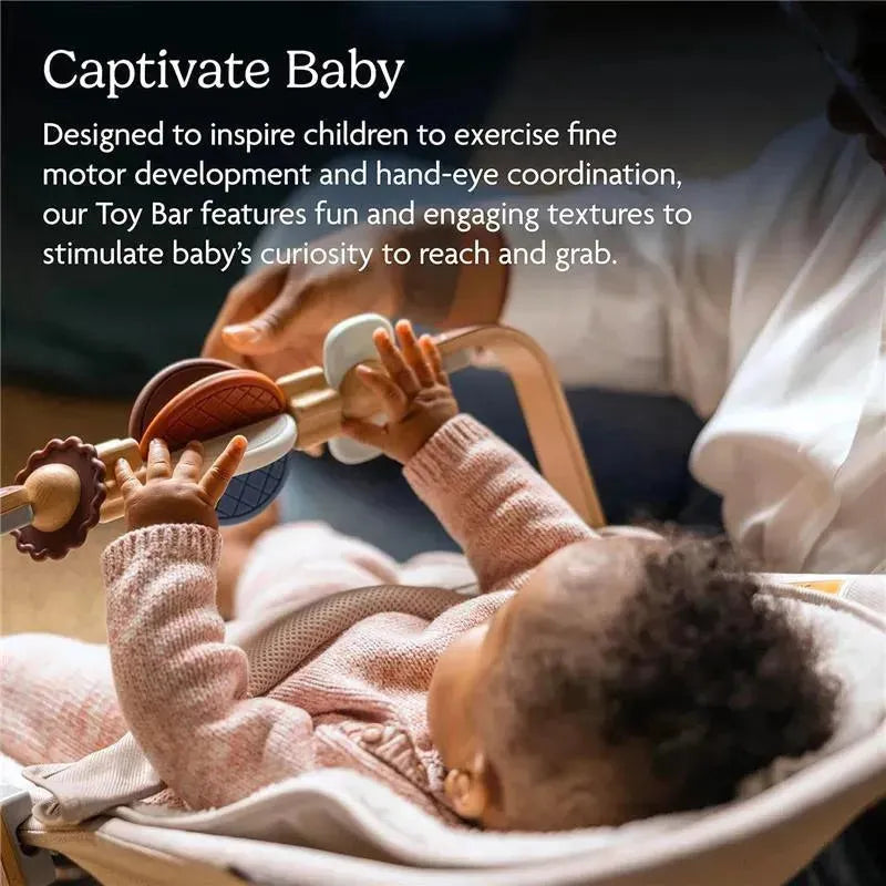 The UPPAbaby Mira Bouncer Toy Bar is a sensory-rich arch that snaps onto the Mira 2-in-1 bouncer to stimulate early development. Crafted from FSC® certified wood and kid-safe fabrics, it features engaging textures and interactive elements—such as spinning animals, squeakers, and crinkles—that encourage reaching, grasping, and auditory exploration. Designed to fold neatly with the Mira and attach without extra tools or straps, it's a seamless addition that enhances fine motor skills and invites natural baby curiosity.