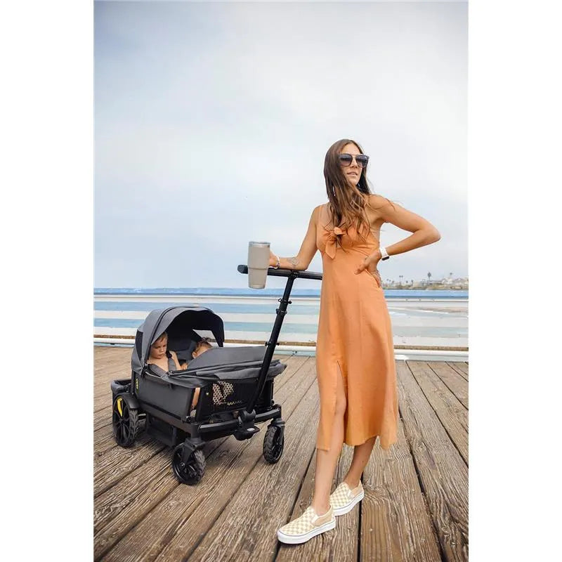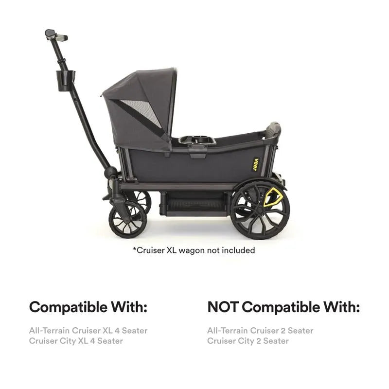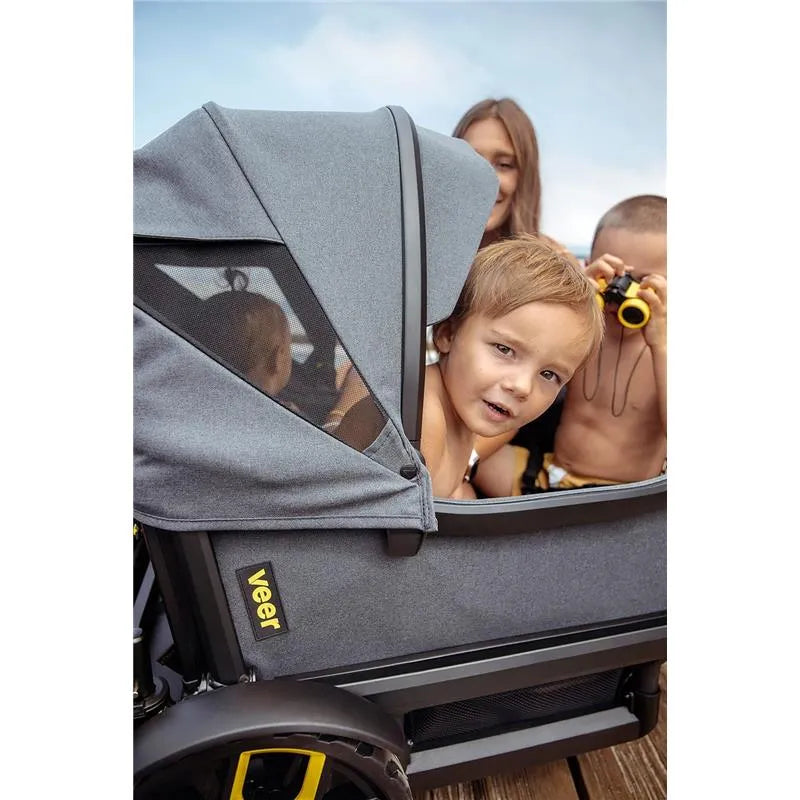 Veer's Retractable Canopies quickly and intuitively clip onto Cruiser XL's frame and easily extend up and down. One or two can be attached, above either seat. A peak-a-boo window allows you to see your precious cargo and discreet, hidden magnets hold the window in the up position. Canopy XL works perfectly with Nap System XL to create the perfect rest stop for young ones.