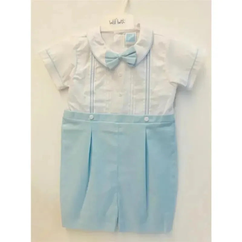 Elegant blue and white boy romper with detachable bowtie. Cotton.